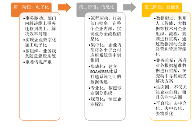 - 第三个阶段是智能化,特点是数据驱动,利用人工智能、大数据等一些先进技术对企业组织、流程、规则进行重塑,通过数据推动企业经营和管理实现智能化,创造新的商业模式、关注生态圈、实现企业平台化。